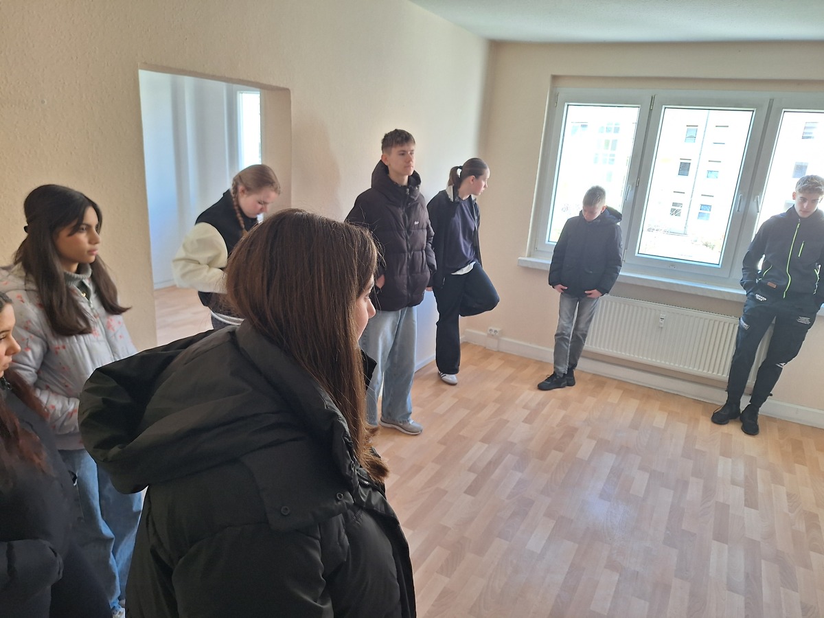 Im Anschluss folgte der praktische Teil, der bei den Jugendlichen auf besonders großes Interesse stieß. Gemeinsam erkundeten sie unseren Wohnungsbestand und bearbeiteten in Teamarbeit eine praxisnahe Aufgabe: In einer Musterwohnung galt es zu entscheiden, welche Sanierungsmaßnahmen erforderlich wären und mit welchen Kosten zu rechnen ist. So konnten die Schülerinnen und Schüler selbst in die Rolle von Immobilienprofis schlüpfen und erleben, wie vielseitig, verantwortungsvoll und spannend die Arbeit in unserem Bereich ist.